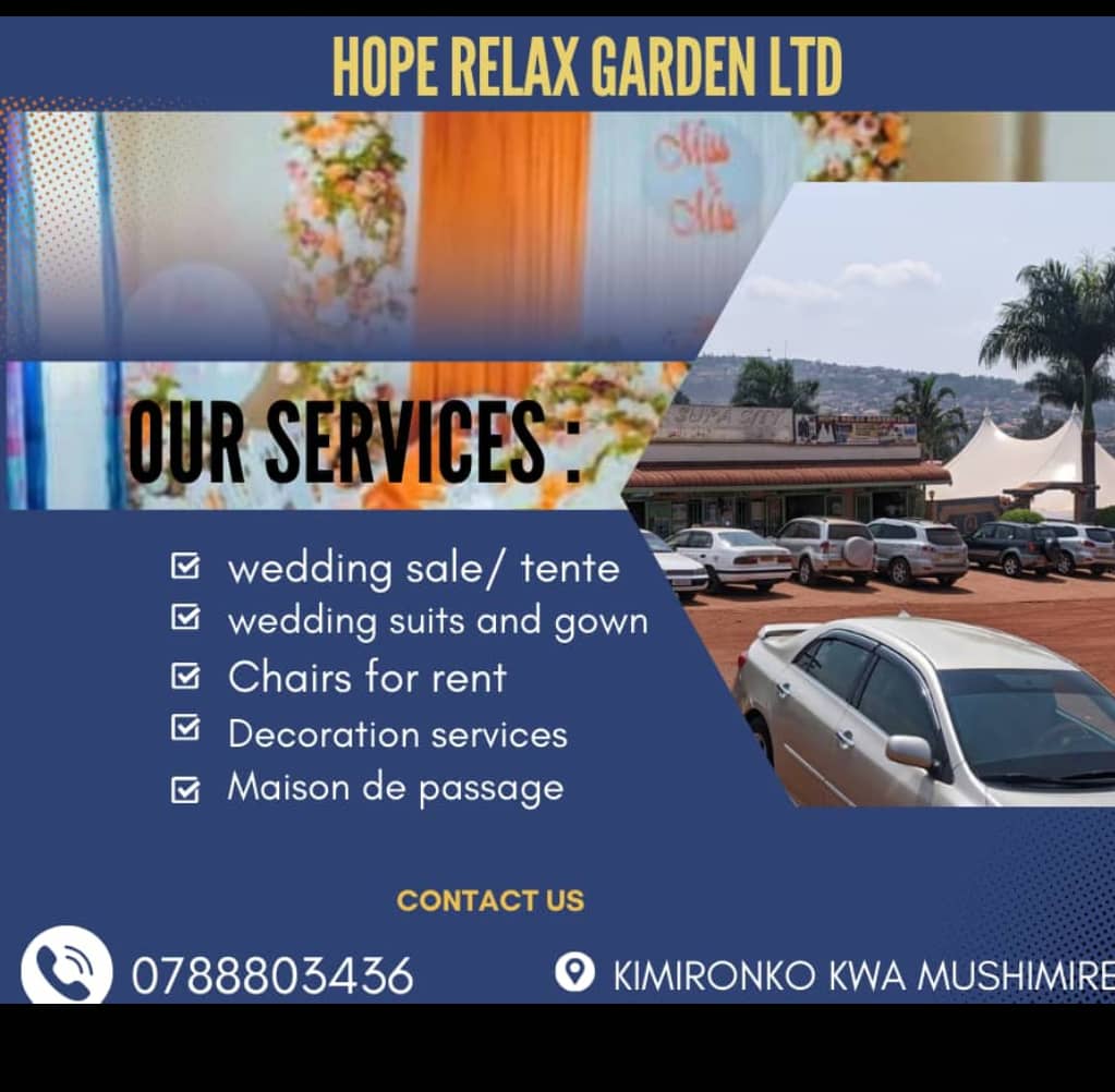 HOPE RELAX GARDEN offers premium decoration services to transform any event into an unforgettable experience. From weddings to corporate gatherings, our expert team provides stunning setups, blending elegance and creativity with your unique vision. We specialize in beautiful floral arrangements, eye-catching centerpieces, and tailored décor themes to match your style and occasion. Located in Kimironko, kwa Mushimire, we bring sophistication to every setting, ensuring that your event is both memorable and visually captivating. Let HOPE RELAX GARDEN add that special touch to make your celebration one-of-a-kind!